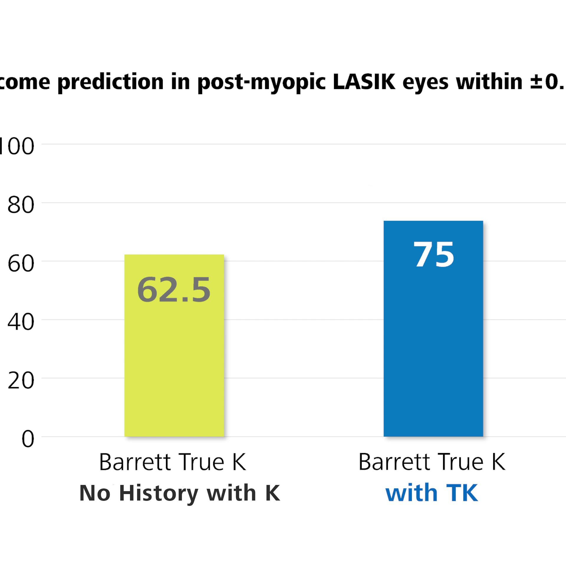 IOL度数計算ZEISS IOLマスター 700のトータルケラトメトリー(Total Keratometry:TK)では、SWEPT Source OCTを使用して角膜後面を直接測定します。ある研究では、TK式を併用したBarrett True Kは、近視矯正のレーシック後の眼で、Classic Kを用いたBarrett True K式と比較して、術後屈折誤差が-0.5D以内となる割合が12.5%高くなりました*。